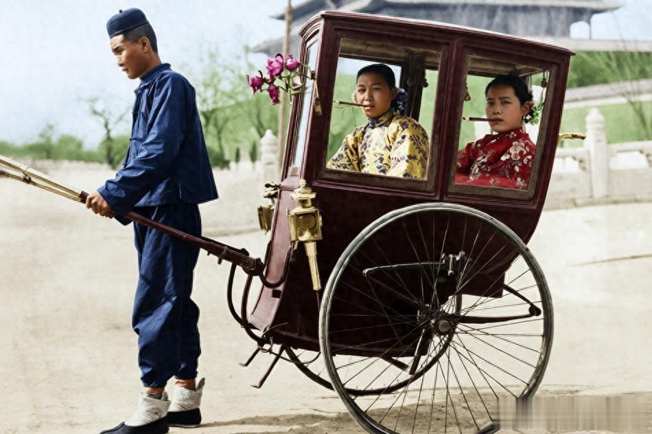 民国时期,北京或上海街头。照片中,一名人力车夫正在拉一辆私人人力车,车厢为封闭式,带有玻璃窗和车灯,属于当时较为高级的款式。