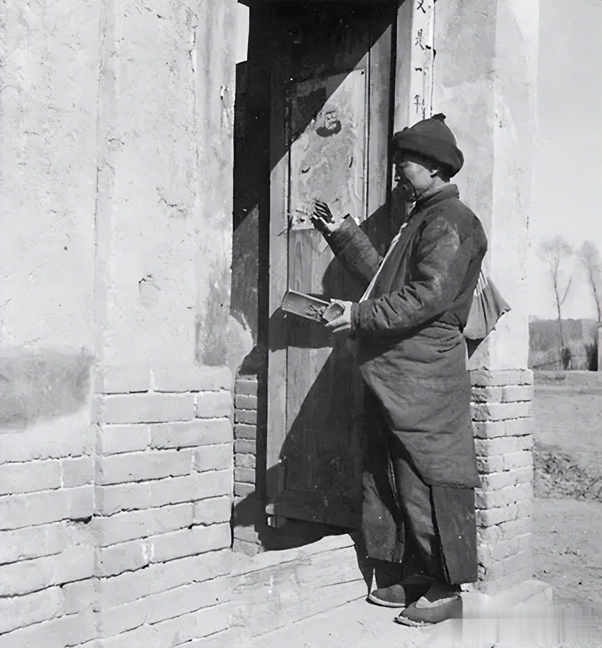 1933-1946年间,海达·莫里循镜头下,砖石砌成的门楼墙皮斑驳,木门上的门神画褪了色,眉眼轮廓还依稀能辨,门楣边的字迹半隐在阴影里。