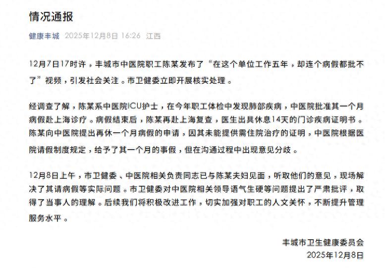宜春丰城一女护士患癌请病假遭拒?医院工作人员称其只讲了部分情况 卫健委:对相关领导语气生硬等严肃批评.大河报.2025-12-08
