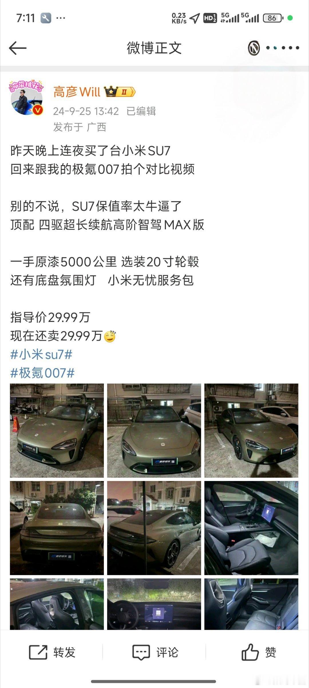兄弟,这么说吧,小米是唯一一个我正儿八经说保值率高的新能源品牌。即便是现在保值率没有之前那么高了,但也算数一数二的。