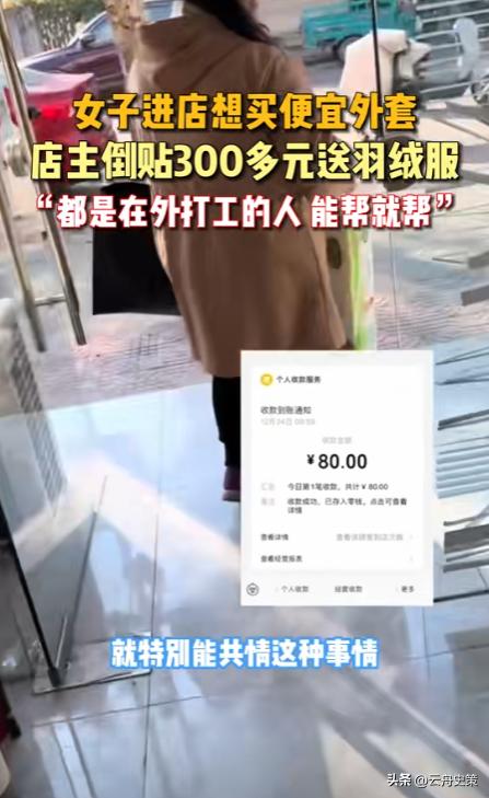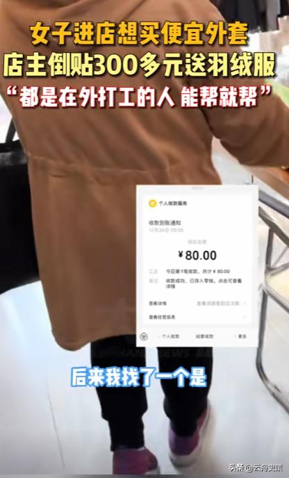 这个老板火了!江苏,一女子刚出来打工没发工资,穿着单薄进店想买便宜的外套,店主见状拿着自家近四百的羽绒服,卖给女子八十元,店主倒贴三百元,并表示:都是在外打工的人,能帮就帮! 女子王女士(化名)在江苏当地开了一家服装店,平常也比较辛苦,需要进货拿货,招待千奇百怪的顾客,将顾客服务的服服帖帖的收揽回头客。 这天她却遇到了一位特别的顾客,一女子在大冬天,穿的衣服外套十分的单薄,小心翼翼的走进她的店铺,王女士见状赶紧上去迎接。 女子上去就开门见山,表示自己刚出来打工没多久,身上没什么钱,这个月也还没有发工资,就想着买一件便宜的外套穿,问王女士哪个外套最便宜。 王女士见状,看女子外出打工不容易,大冬天的无非就是想要买个外套穿出去能保暖,又碍于金钱压力,买不起保暖的,只能买便宜的应付,就特别的心疼,打工人共情打工人,就想着尽自己的绵薄之力帮一帮女子。 于是就拿出了自己店里面进货价近四百的羽绒服,让女子试穿,并以八十块钱的价格,卖给了女子,自己则倒贴了三百多,但行好事莫问前程,事后女子将视频发到了网上讲述自己的经历,希望大家多一点善心,遇到需要帮助的人都能够尽自己所能,尽一份力量。 没想到视频刚发出去就感动了无数网友,大家纷纷表示,这样的好老板不好找了!好人一生平安!