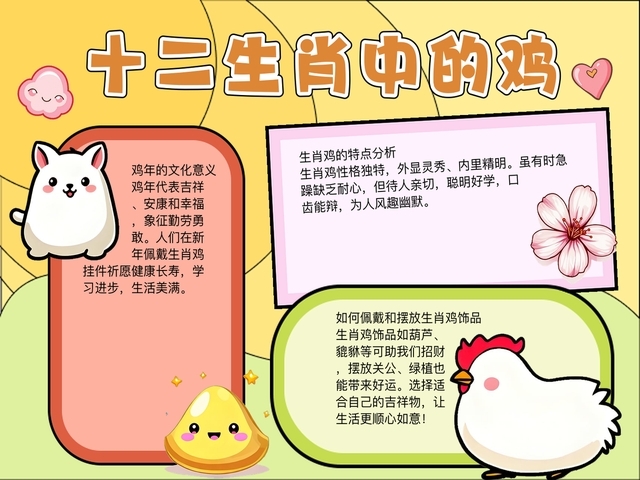 综上所述,属鸡之人的贵人生肖主要包括属龙、属蛇和属牛。这些生肖的人在属鸡人的生活中往往扮演着重要的角色,能够为他们提供支持和帮助,促进他们的成长和发展。当然,这只是易经与生肖配对理论中的一种观点,实际生活中每个人的性格和命运都受到多种因素的影响。