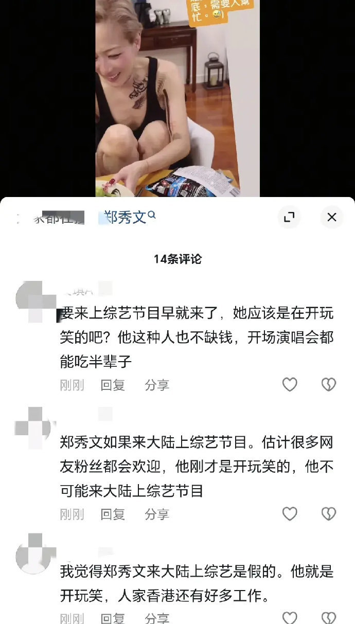 著名女星郑秀文在自己家中和经纪人痛哭流泪,在家躺平好久,感觉自己还年轻不能这么浪费时光,表示花重金拜托大陆的相关公司负责人帮忙,想找内地比较火的综艺节目去上,可是被告时暂时没节目