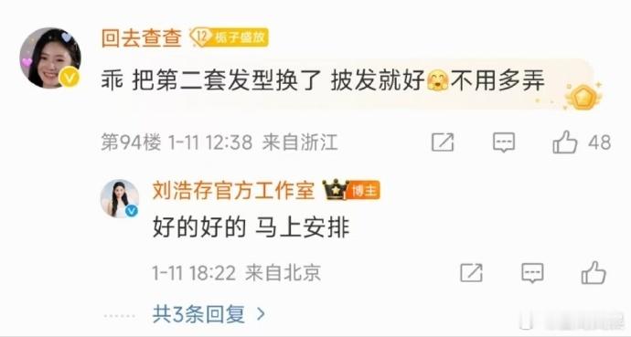 刘浩存工作室 听劝 刘浩存工作室这次在听劝方面做得太出色了。粉丝提及造型改进,工作室马上回复修改,这种尊重粉丝、积极互动的态度,让我们对妹妹美美的披发造型有了更多美好的期许。
