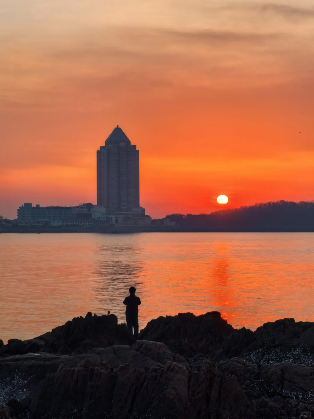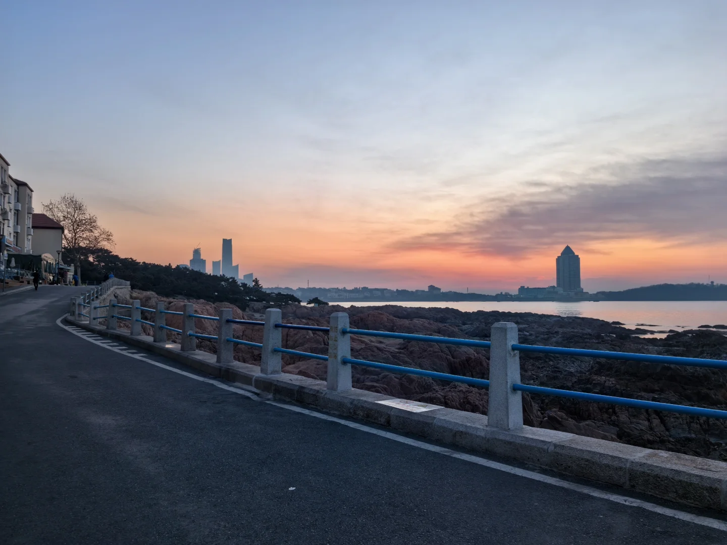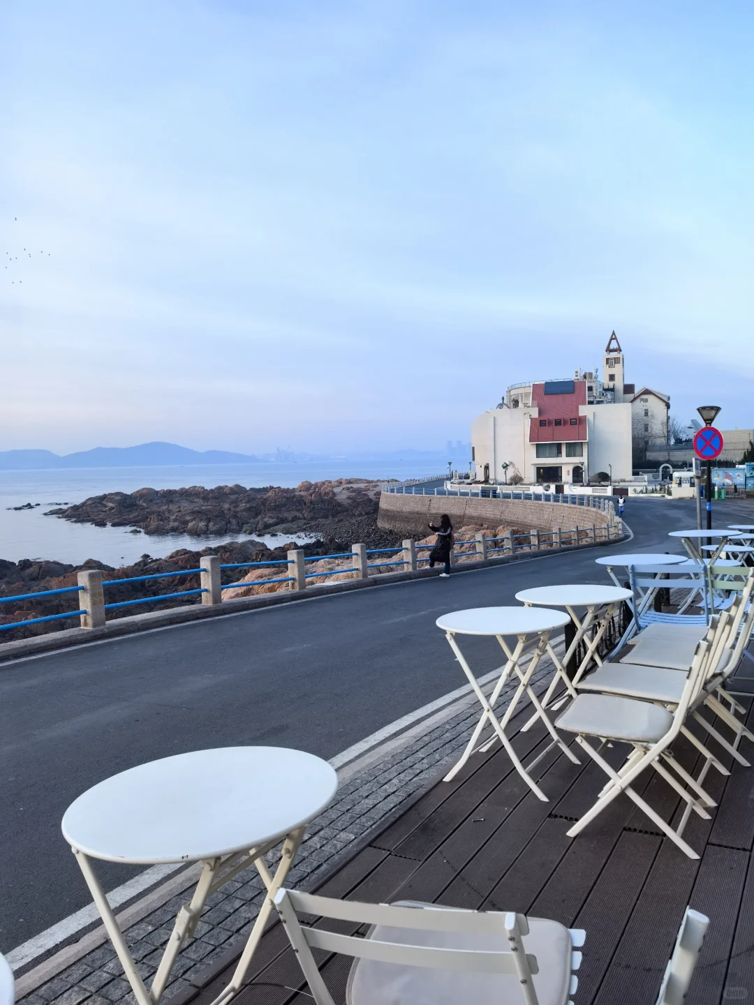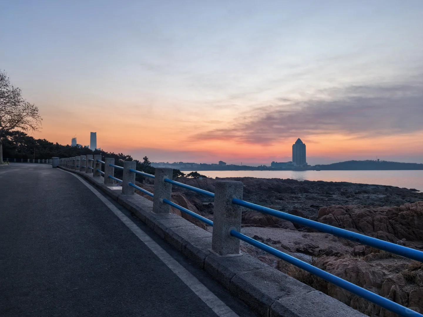 太阳正在升起,天上成片海鸥着急飞去栈桥上班打卡。因此不必去栈桥太早,每日根据日出时间判断海鸥是否已入场即可。另外,咱们青岛管事的能否把琴屿路街边改造升级一下,那么红的网红街,这商家的户外设施跟这美景有点差距啊。
