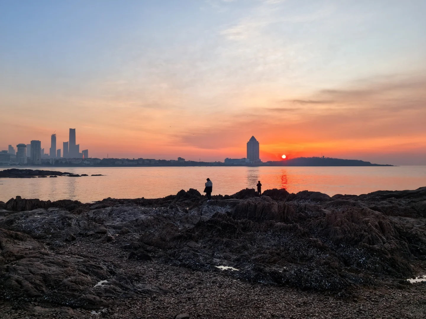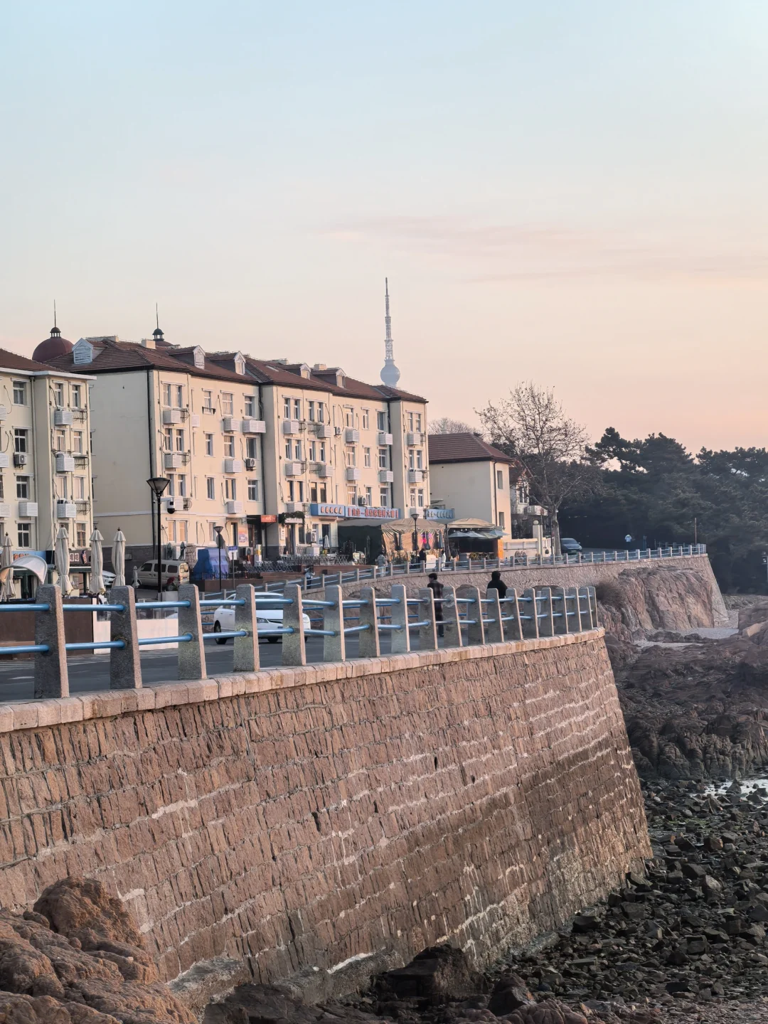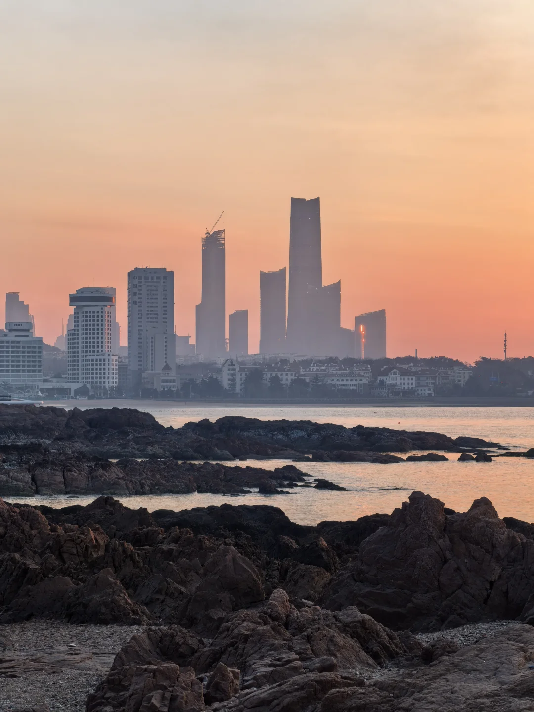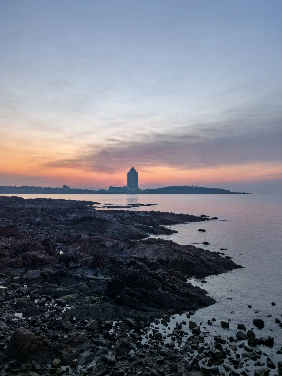 太阳正在升起,天上成片海鸥着急飞去栈桥上班打卡。因此不必去栈桥太早,每日根据日出时间判断海鸥是否已入场即可。另外,咱们青岛管事的能否把琴屿路街边改造升级一下,那么红的网红街,这商家的户外设施跟这美景有点差距啊。
