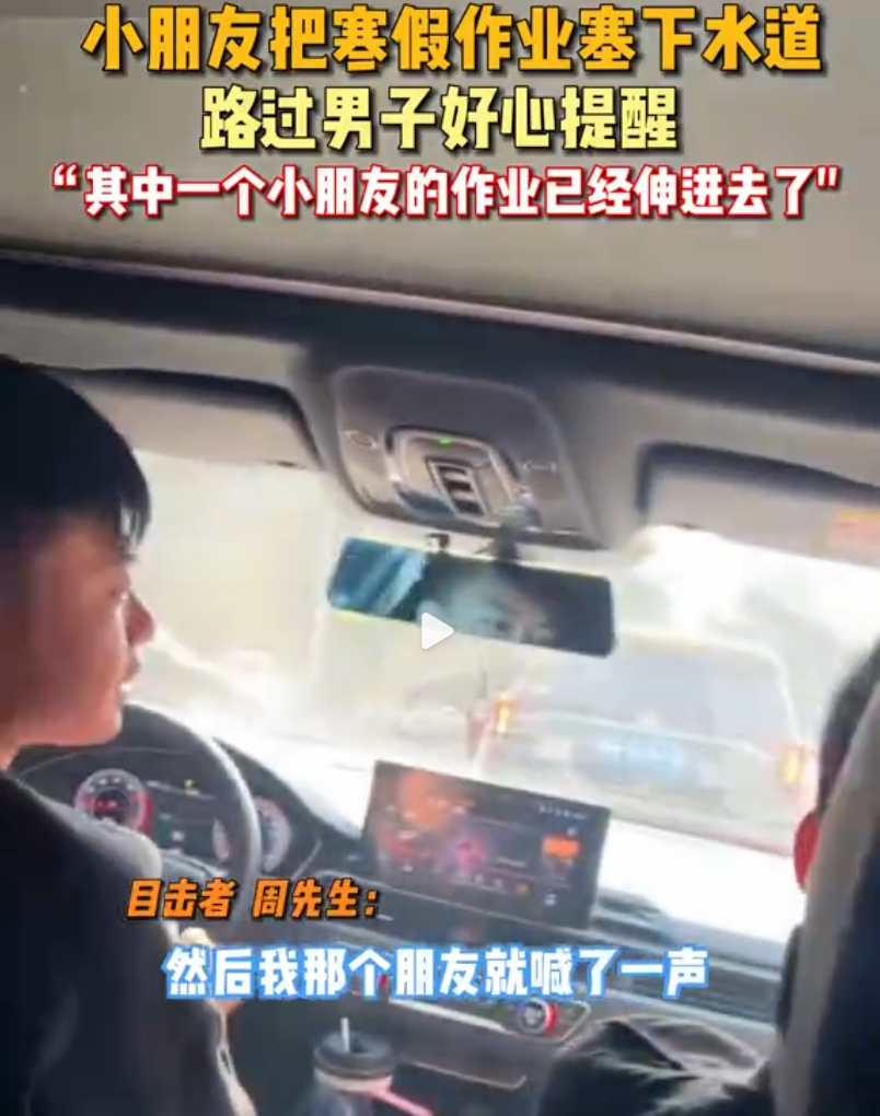 1月17日,广西柳州,俩小孩试图将寒假作业扔进下水道“销毁”,一男子路过好心提醒