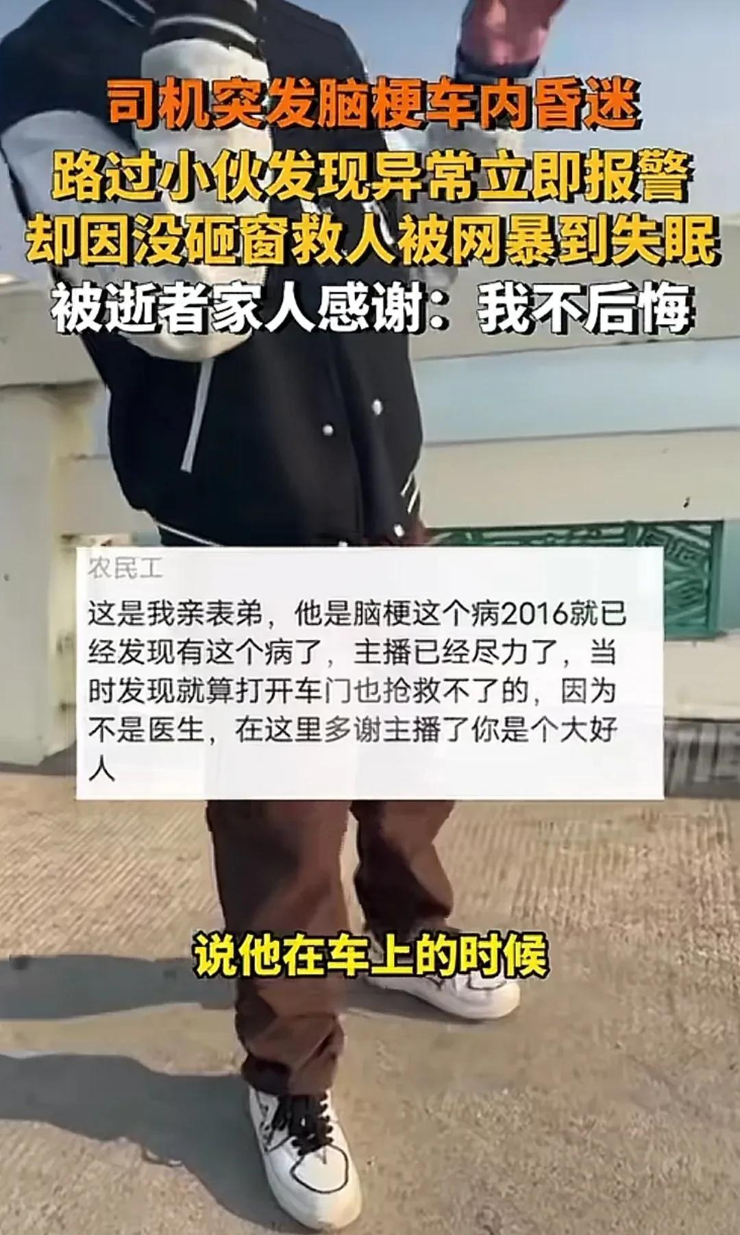 报警救人遭网暴,站着说话不腰疼!司机突发脑梗车内昏迷,路过小伙发现异常立马报警,却因没砸窗救人遭网暴到失眠,幸亏逝者家人理解并感谢。 近日,广西南宁的黄先生发现一辆车慢慢停靠在路边,司机张着嘴巴一动不动,敲了半天窗户没反应,他就感觉司机应该是出事了,马上报警打了120,司机被送往了医院。后来警察回访说,司机在车里就已经去世了,听到司机去世的消息,黄先生也有些内疚难过。 视频到网上了,很多网友指责他,甚至有的人污言秽语攻击他,整得黄先生精神状态不好而失眠。 有网友说他为什么不第一时间破窗救人,怀疑他在故意拖延时间,有说他涉嫌过失致人死亡,还有的人说他的认知能力有问题,睡着了和发病了都分不清,甚至有的人直接出言不逊的骂人。 此事搞得黄先生苦不堪言,本来是做件好事,没想到遭到网暴。幸亏逝者几位家属很理解并感谢黄先生,出面澄清事实,说逝者2016年就得了脑梗,主播己经尽力了,即使当时打开车门也救不了的,称黄先生是大好人。 黄先生称,虽然没有得到所有人的理解,受了委屈,但他不后悔。 真是动嘴的比动手的人多,总也不可能做得人人满意,总有人鸡蛋里挑骨头,即使当时第一时间敲窗开门救人,黄先生又不是专业人士,估计又有人称不专业等问题。 我觉得黄先生是好人,做得非常好,第一时间报警又打120,专业的事交给专业的人做,否则会弄巧成拙。 那些站着说话不腰疼的人,不要只是口嗨,嘴上积点德,拿出行动,做得像黄先生这样就足够了。 对于乐于助人的好人,我们要宽容,不要力求完美,他们的立场是好的,不能让他们成为“背锅侠”,寒了好心人的心。