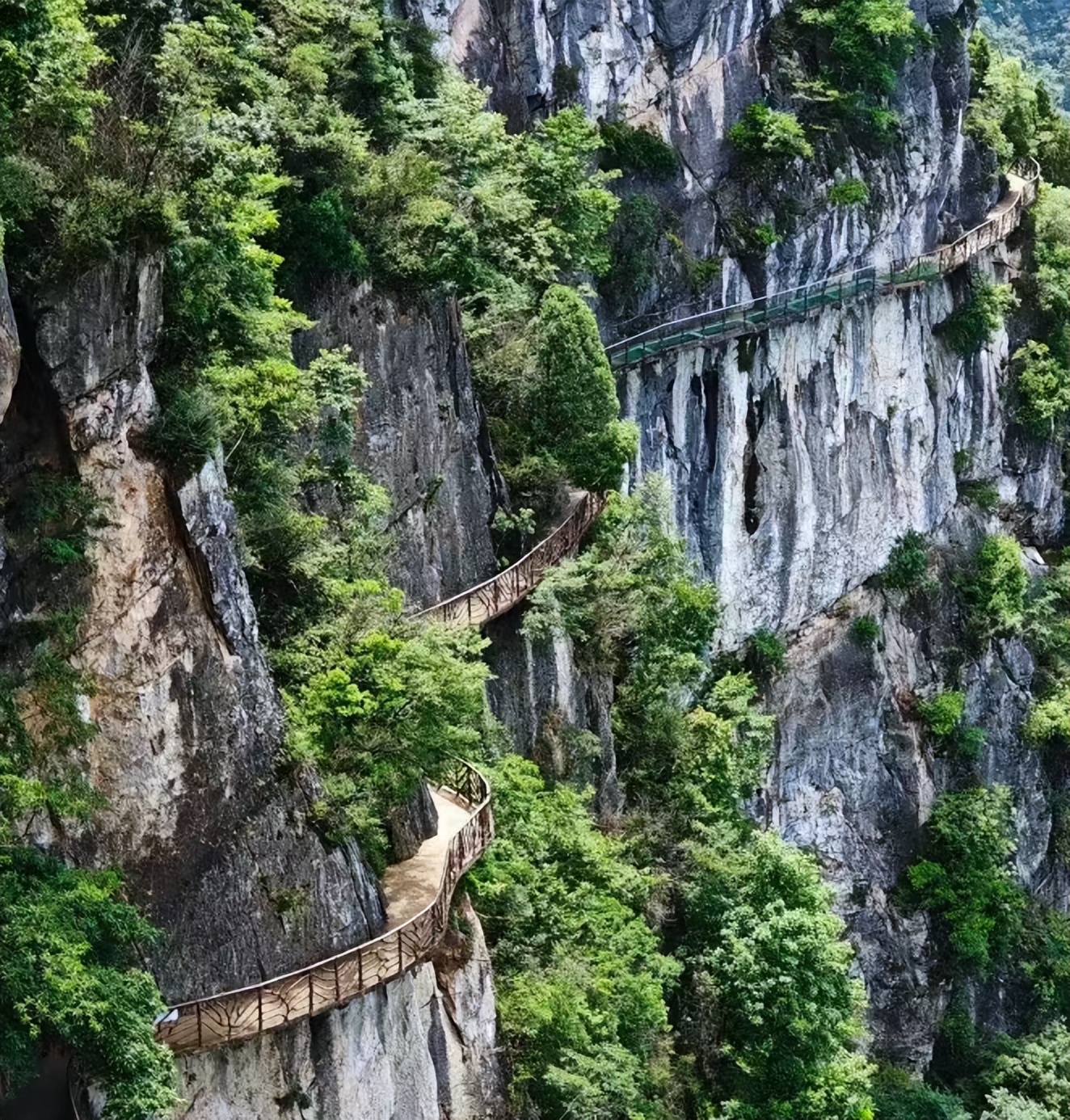 这里有绵延千米的连天栈道;有惊险又刺激的 5D 特效玻璃吊桥;还有森林、田间,就像现实版的桃花源……这儿有能替代阿勒泰风光的美景,可以徒步差不多 20 千米;还有高山、溪流、山谷,以及长江的浪漫……