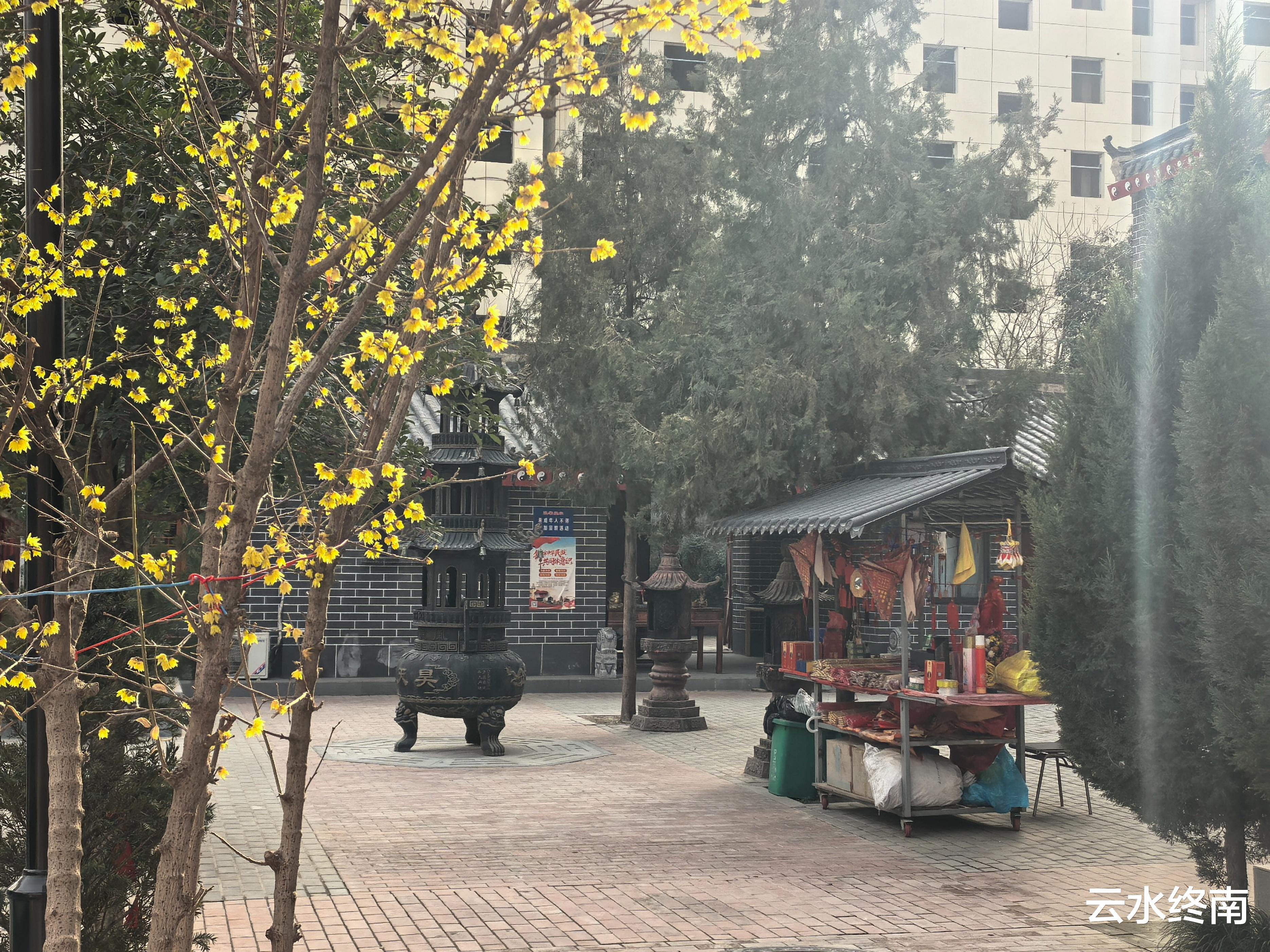 道长过来了,看我们在金灿灿的腊梅下面,说院子里还有珍贵的紫斑牡丹,是信众移过来的,说这个是陕西省唯一的,等四月花开的时候过来欣赏,很美的。