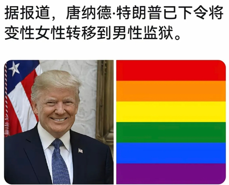 特朗普的速度就是快啊,据外媒称:他上任后就下令,要求将监狱里的跨性别女性转移到男性监狱,并在监狱里接受与性别相关的治疗,要知道,美国原本有七十多种性别,现在特朗普只承认男女两种,不知道他们以前怎么关押的,反正现在这条命令一下,怕是很多人要成为众矢之的了吧