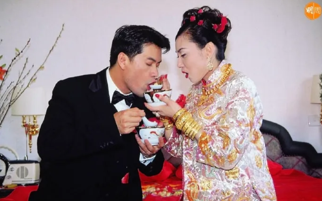 这是当年香港明星吕良伟和邝美云结婚的照片。新娘脖子和手腕上都带了好多金饰,两人拜