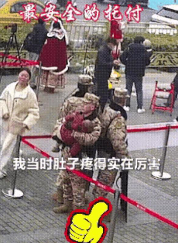 这是在西安的鼓楼附近,一个抱着孩子的年轻的妈妈肚子疼了起来,想都没有想,就将自己的孩子交给了正在旁边执勤的一个武警战士。