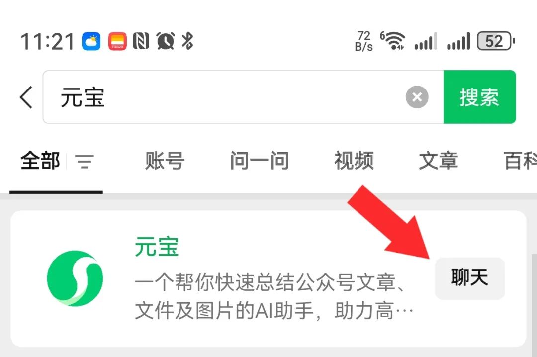 打开微信,点击右上角搜索图标并输入“元宝”之后就会出现相应的功能入口。在这里找到右侧标记了“聊天”入口的元宝工具点击进入,它会提示你添加到通讯录。