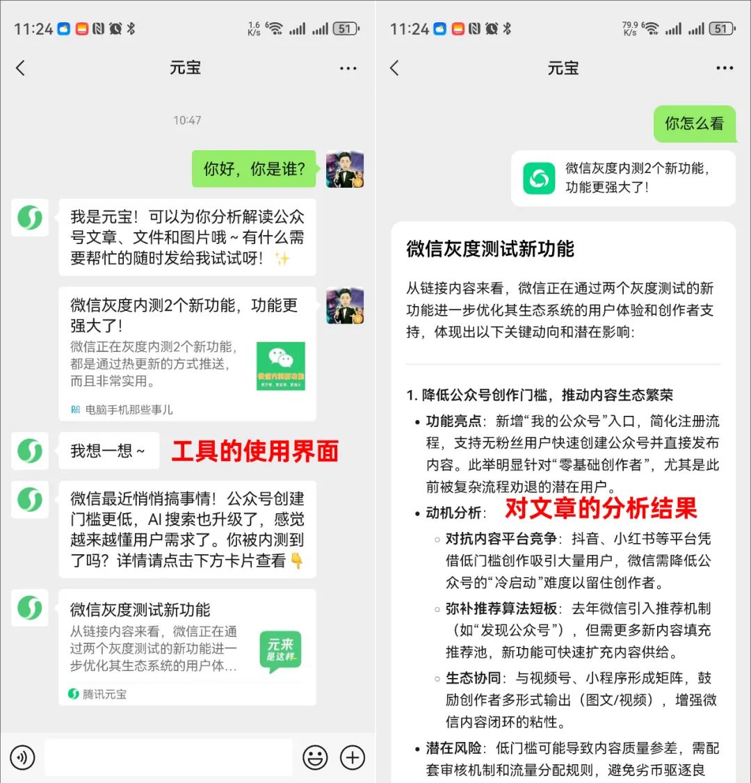根据微信官方对于这款元宝AI助手的介绍,它可以为我们解析公众号文章、图片和文档,并且支持对解读的内容进行多种方式的智能互动。同时,在这段介绍的内容中出现了“越聊越懂你”的字样,也意味着微信的这款元宝AI助手能够通过与用户的不断互动而掌握用户的喜好和需求,从而提供更加准确、个性化的答案和服务。