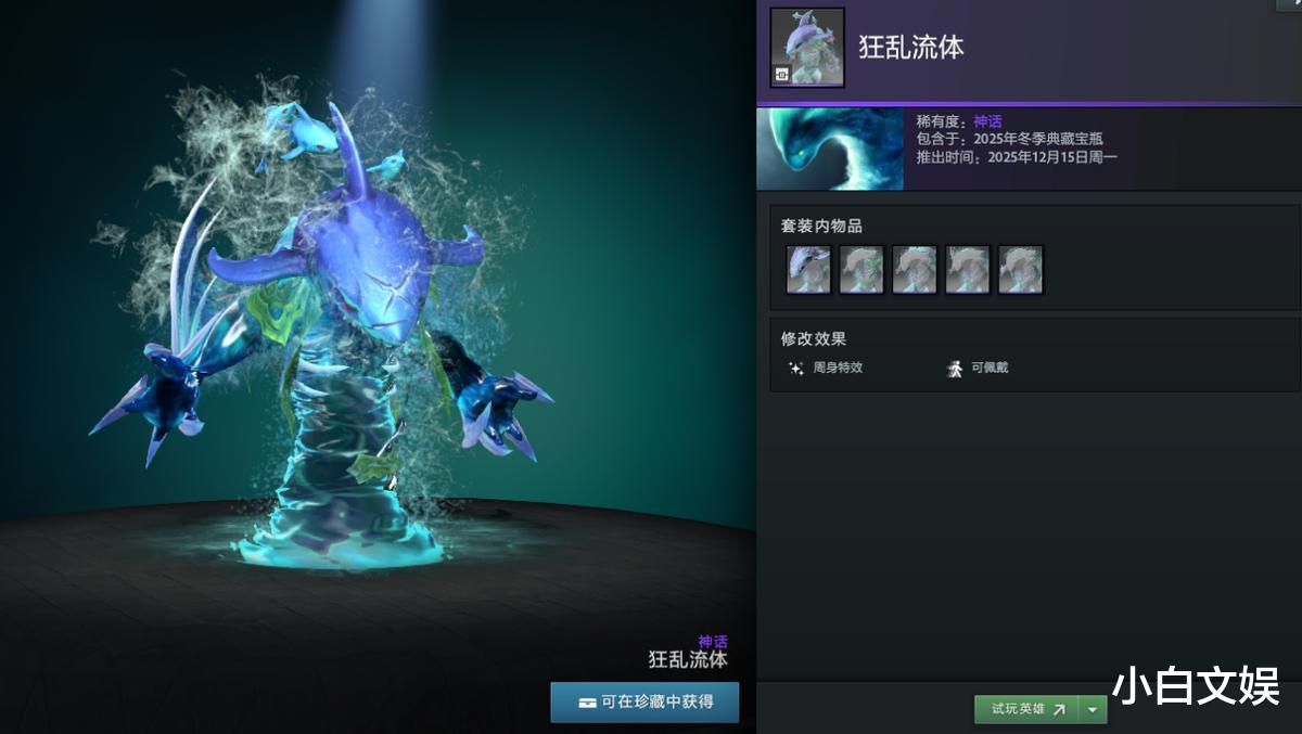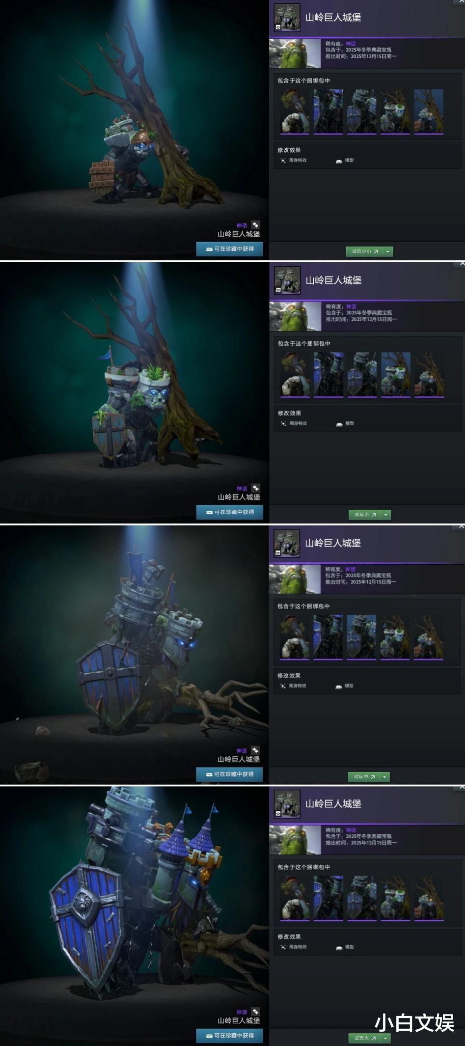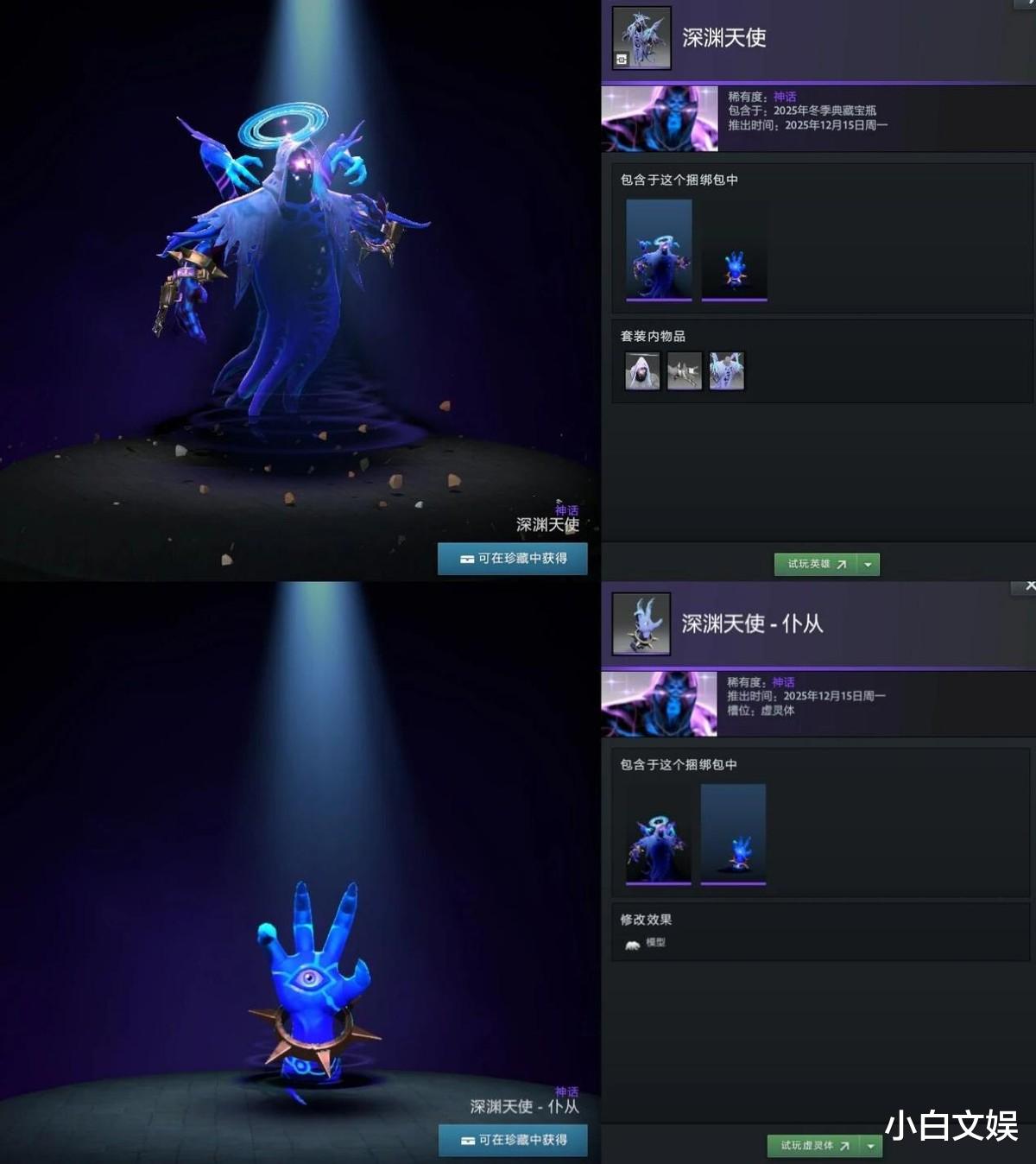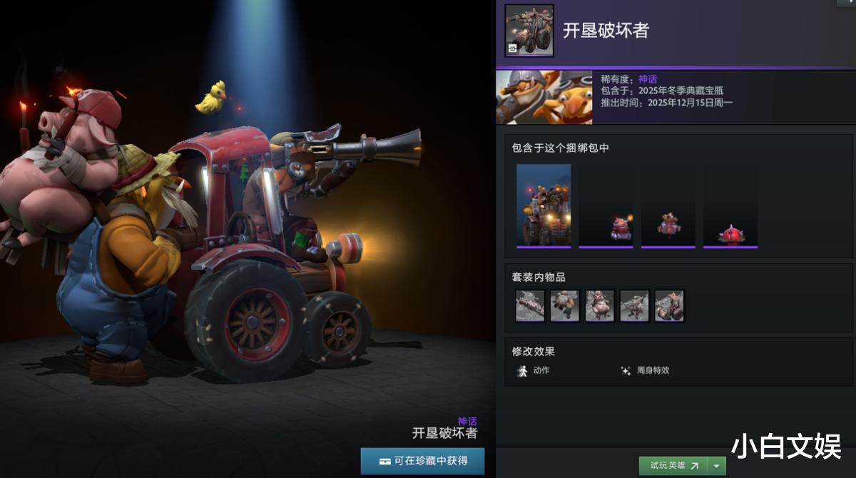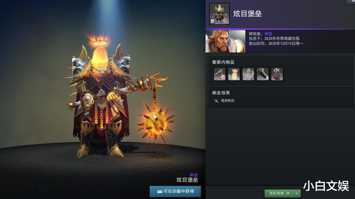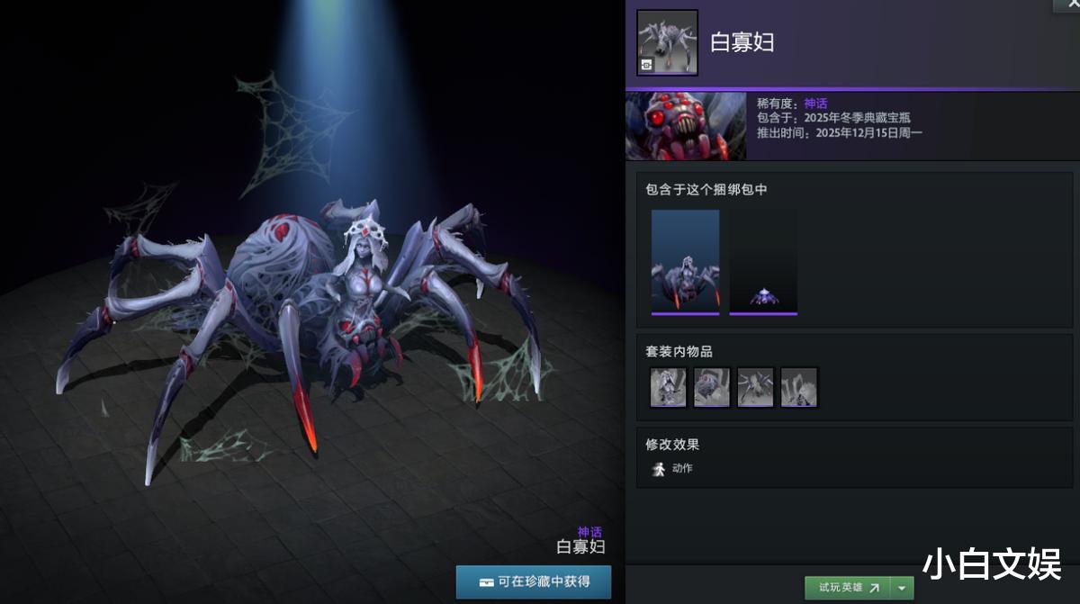 本次更新还带来了2025年冬季典藏宝瓶,内含16套英雄套装,12套普通,4套珍稀。如帕吉身心套装“暴食之痴”,解开套装未拥有帕吉身心玩具屠夫将额外获得;兽的“史前掠夺者”套装身披兽骨;潮汐猎人“巨海之欲”套装戴鲨鱼头;陈的“纷争之籽”套装以小熊猫为坐骑;半人马战行者“灵巧伪装”套装化身小驴;变体精灵“狂乱流体”套装有鲨鱼头;山岭巨人“城堡”套装随大招等级提升外观变化。此外还有影魔、育母蜘蛛等多种英雄套装。影魔和齐天大圣至宝拆分基部,可自由搭配饰品。
