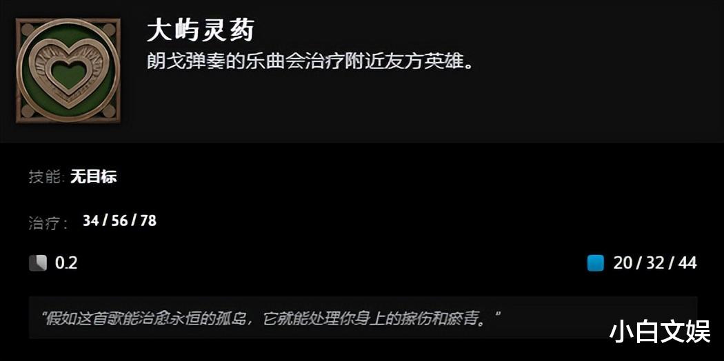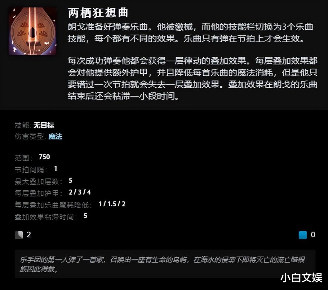 终极技能“两栖狂想曲”,朗戈准备弹奏乐曲,被缴械且技能栏切换为3个乐曲技能,成功弹奏获得得律动叠加效果,增加护甲、降低魔法消耗,错过节拍则失去一层。乐曲一“巨腹闪电战”能增强友方技能,使友方攻击造成额外魔法伤害;乐曲二“疾步生风”提升友方移速,增加减速抗性;乐曲三“大屿灵药”治疗友方英雄。