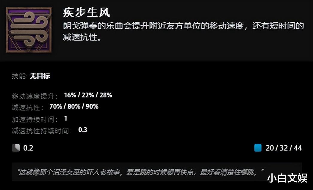 三技能“灵呱一闪”,为友方英雄弹奏小调,降低其技能和物品的魔法消耗,造成伤害会回响,接下来5秒内再次造成原本伤害的一定百分比。如果被增益的右方消耗魔法,则会减少增益剩余时间。