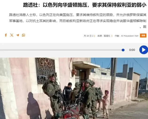 来自路透社的消息,以色列正在游说美国和特朗普政府在阿萨德政权垮台后保持叙利亚的弱小和权力分散,包括允许俄罗斯在叙利亚保留其海军和空军基地,以对抗土耳其和土耳其对新一届叙利亚政府的影响。