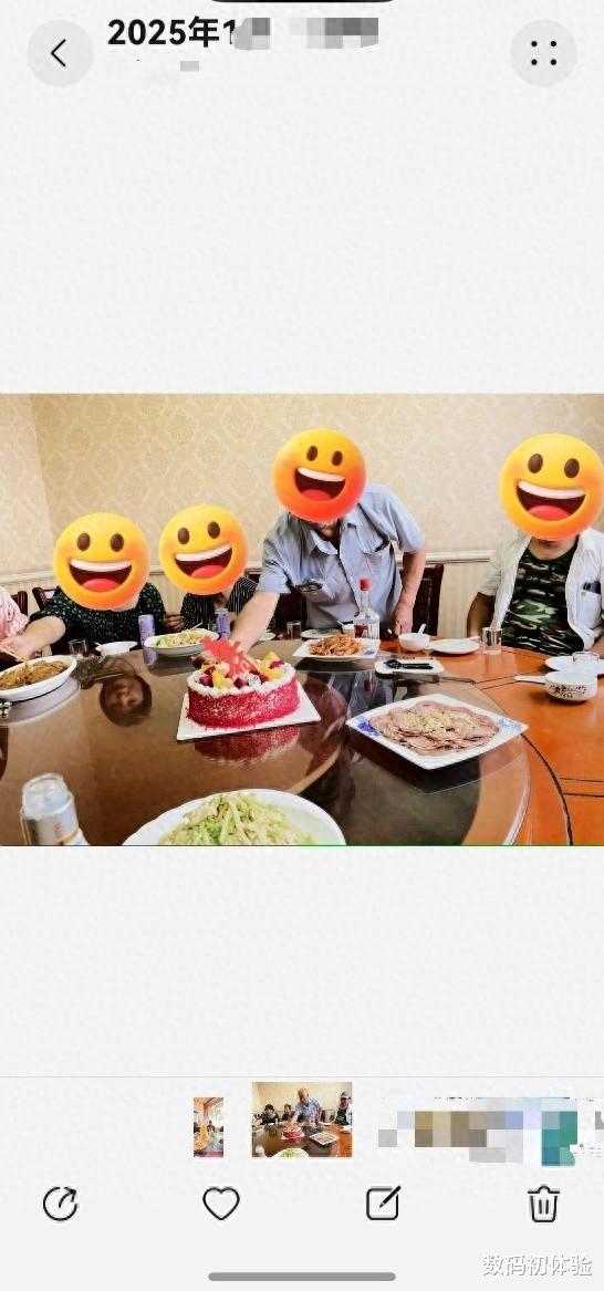 那是爷爷83岁的生日。一大家子人没有去城里的大饭店,而是在老家镇上那家开了十几年的小馆子。照片里没有什么精致的摆盘,但饭菜热气腾腾,氛围极佳。爷爷则起身,要给我们分蛋糕。他脸上那种平静、安稳的神情,透过屏幕直击人心。