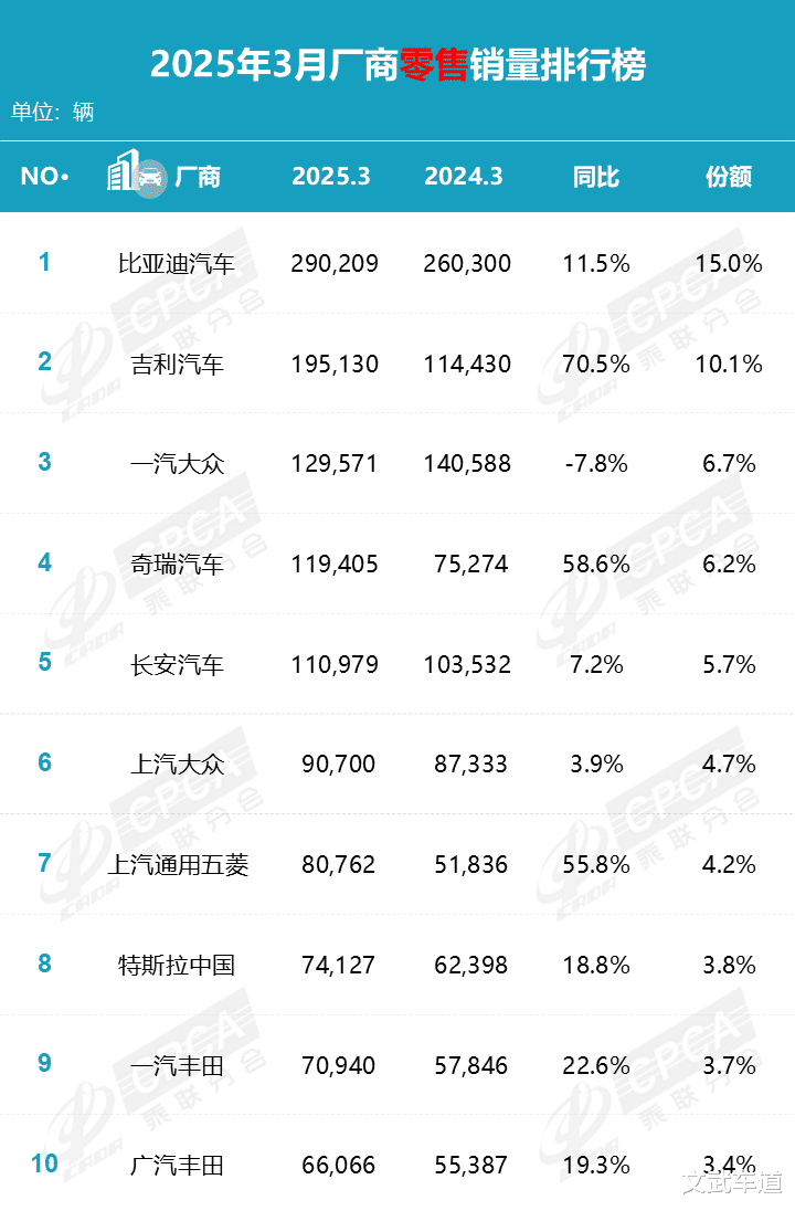 而一汽丰田和广汽丰田在3月份双双进入前十,销量分别达到了70940辆和66066辆,分别同比增长了22.6%和19.3%。其中在3月6日,广汽丰田铂智3X正式上市,新车凭借着智驾和颇具诚意的价格,上市以来的关注度持续提升。不过东风本田和广汽本田继续跌出了前十的行列。