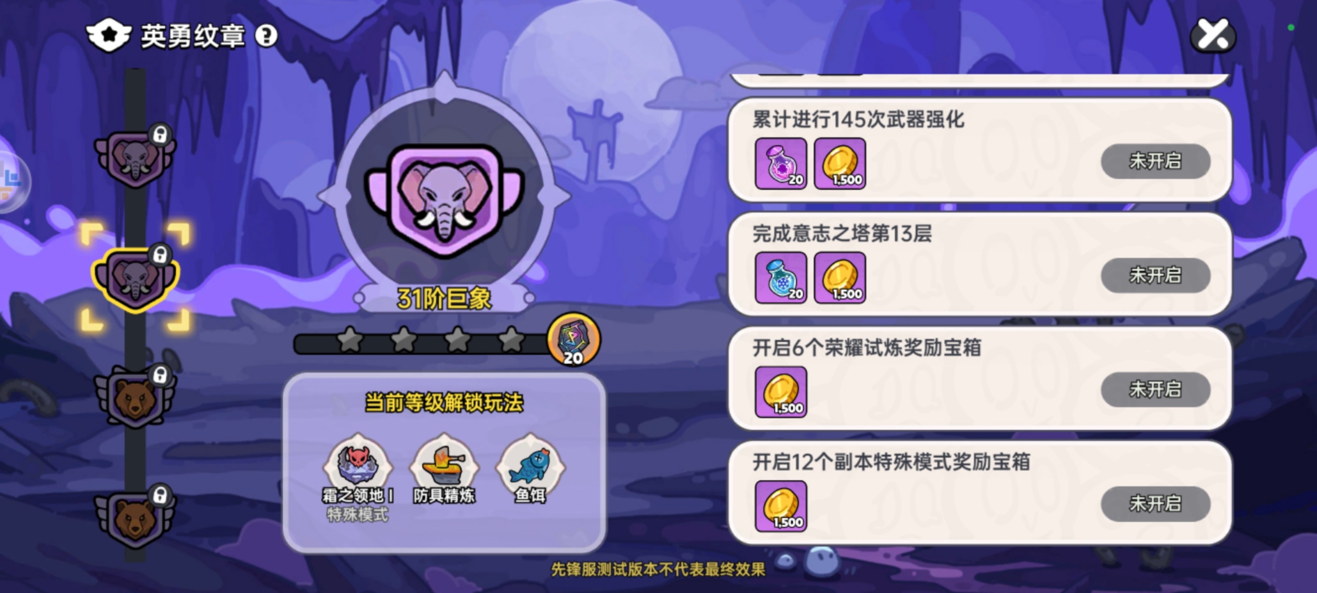 1.优先完成纹章任务,解锁更多游戏内容(第二天最高能达到 31阶巨象)