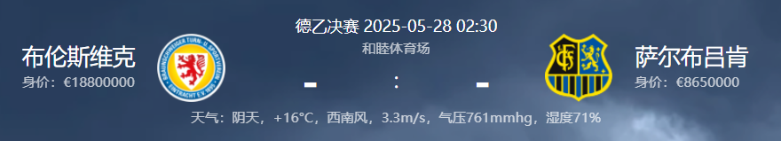 不伦瑞克的“保级基因”有多恐怖? 这支球队连续三个赛季在降级区边缘跳舞,却年年成功上岸,堪称德乙“不死小强”。首回合客场2-0的胜利已经让他们掌握绝对主动权,平局=保级的容错空间足以让球员心态稳如老狗。更关键的是,新帅施耐德变阵343后激活了攻防体系,边翼卫里特米勒的边路突破和前锋菲利普的支点作用(首回合梅开二度)成为破局利器。尽管后防线本赛季丢64球(联赛第二多),但首回合零封萨尔布吕肯证明他们能在关键战中“突然变硬”。