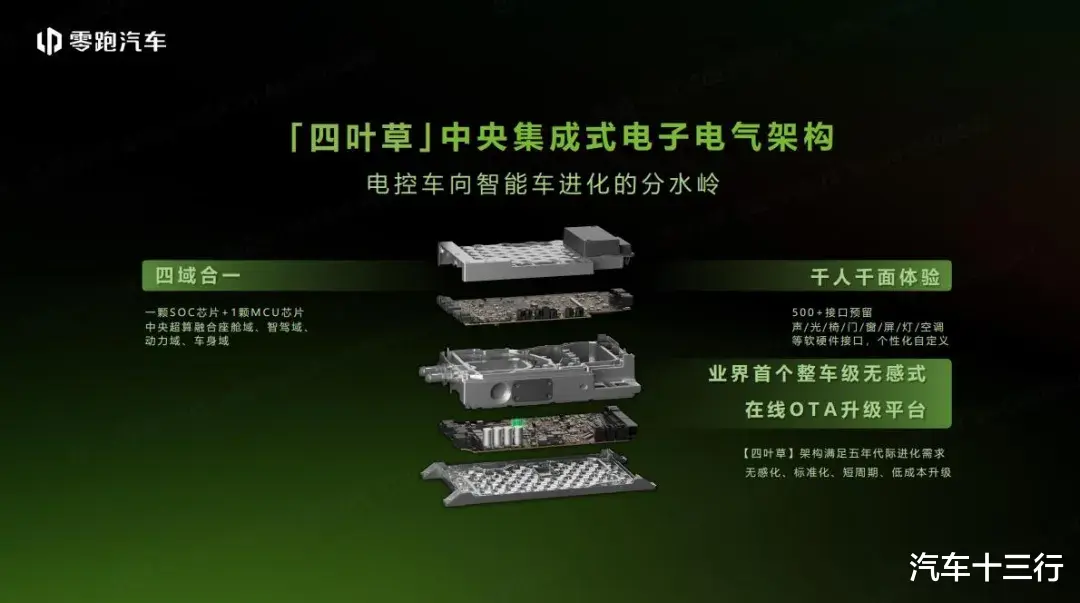 零跑汽车对于现在的一汽来说为什么是适配的合作伙伴?这就不得不从技术体系上说起,零跑汽车的技术除了很全面之外,更重要的在于好而不贵的价值,并且合作接口开的很大。要知道,当下新能源汽车不能不谈智能,而谈智能就必须从底层造车逻辑上说起,这绕不开整车的电子电气架构。从目前来看,整车电子电气架构集成度高、并且能迅速和其他车企开源合作的,恐怕零跑汽车是再合适不过的选择了。从造车第一天开始,零跑就想好了既要做To C的生意,也要做好To B的生意。零跑汽车中央集成电子电气架构从发布当天就命名为“四叶草”架构,并且分出了三个档次。第三方既可以像选择商品一样寻找适配自身的解决方案,也可以深度与零跑开展合作。