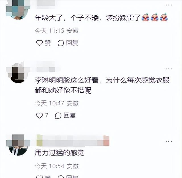 还有人直接说小李琳“用力过猛”,说她年纪大了想装嫩却没装到点子上,结果装扮踩雷了。