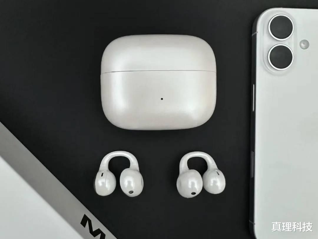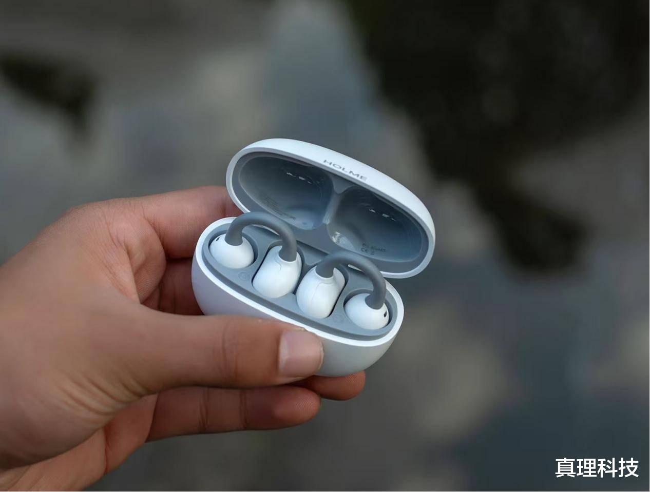 佩戴设计特别贴心,耳机用了2.5mm 的错位设计,戴在耳朵上是前高后低的样子,特别贴合耳朵形状,戴着特别稳;还有∠ 12° 的弧面耳托,把耳机电池那块做成了弧形,能贴紧耳背,舒适度自然也更好;单个耳机才 4.5 克,就算戴好久,耳朵也没啥负担,完全不会有压迫感。