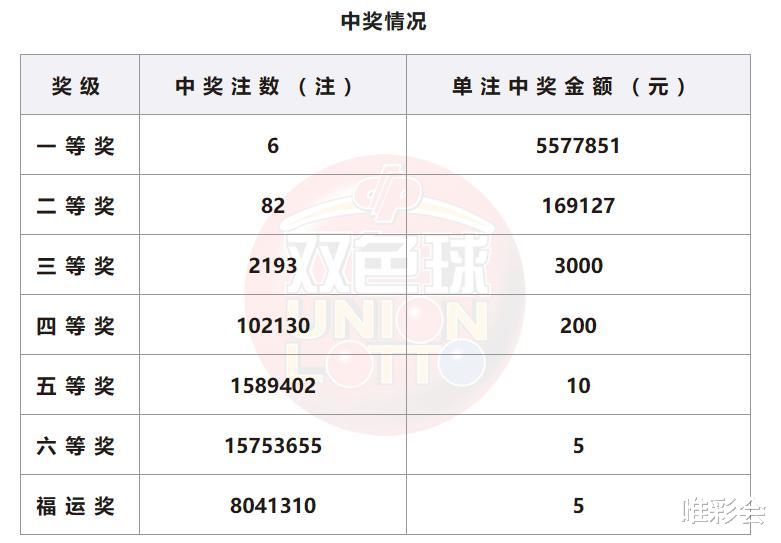 一等奖中奖情况:内蒙古1注,上海1注,浙江1注,重庆1注,四川1注,云南1注,共6注,单注奖金557万。