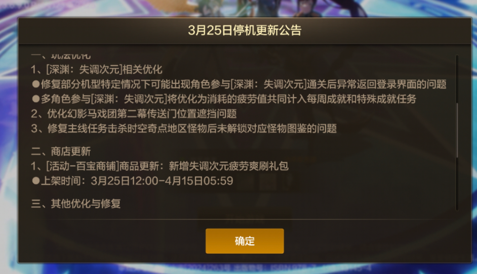 另外这次25号也是进行了一次版本更新,这次更新主要是对深渊玩法进行了优化,这是新深渊首次改版优化。这次修复了深渊的异常问题,并且多角色刷深渊的疲劳值也算入每周成就和特殊成就任务了。另外就是这次又上线了一个疲劳值礼包,助力大家快速毕业。