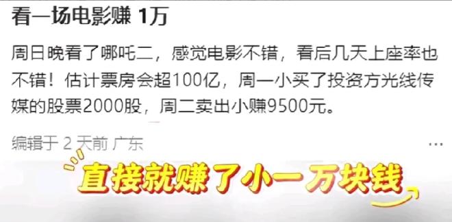 人真的挣不到认知以外的钱!大多数观众顶多随大流去电影院买张票看哪吒,但真正聪明的人,早在哪吒轻轻松松破20亿票房后,转头就去买发行方光线传媒的股票,一番买入卖出操作,几天净赚几万! 中国电影史上,《哪吒之魔童闹海》以惊人的90亿票房成绩,如一道闪电划破了文化产业的天空。这不仅是一次艺术的胜利,更是一场关于财富逻辑的深刻启示。 电影的成功背后,蕴含着“让系统为你赚钱”的智慧。从票房分账到衍生品授权,再到流媒体版权,一部爆款电影犹如一台精密的印钞机,源源不断地产生现金流。这种持续性收益模式,正是投资界推崇的“会下金蛋的鹅”。 曾几何时,电影仅仅是一种娱乐消遣,而今天,它已然成为一种可以量化的资产。普通人也能通过参与众筹、购买相关股票或基金等方式,分享这一盛宴。这种参与不再局限于简单的消费行为,而是向着投资领域迈进。 然而,光鲜亮丽的数字背后,隐藏着不容忽视的风险。影视行业的高投入、高风险特性要求投资者保持清醒。正如股市有涨有跌,电影也有赢有亏。分散投资、理性决策成为在这个领域立足的关键。 对于处于人生中场的中年群体,电影经济所体现的资产化思维尤其值得关注。它启示我们,财富积累不应局限于传统的储蓄或房产投资,而应该以更开放的心态,拥抱新兴的投资机会。 然而,盲目跟风终究不是明智之举。真正的智慧在于培养前瞻性的眼光,洞察市场趋势。一些敏锐的投资者早已将目光投向了电影公司的股票,在票房数据飙升的同时,收获了可观的投资回报。 投资世界充满未知,结果往往难以预料。正因如此,不断提升自己的认知水平显得尤为重要。它不仅能帮助我们识别潜在的投资机会,还能让我们在瞬息万变的市场中保持冷静和理性。 《哪吒之魔童闹海》的成功,不仅是一个文化现象,更是一堂生动的投资课。它告诉我们,在这个信息爆炸的时代,财富的积累不再仅仅依赖于辛勤劳作,更在于如何巧妙地利用系统和资源。