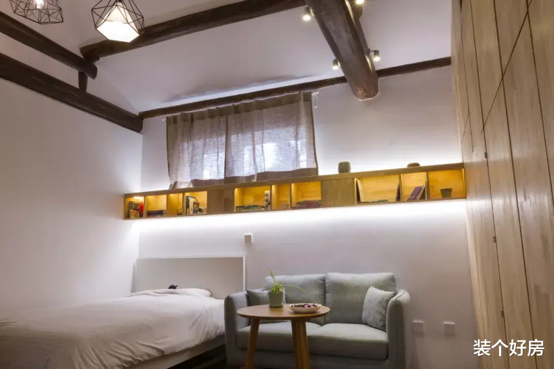 卧室在二层小阁楼里,窗户下方设计了长条形的收纳书柜,展示与收纳两不误。