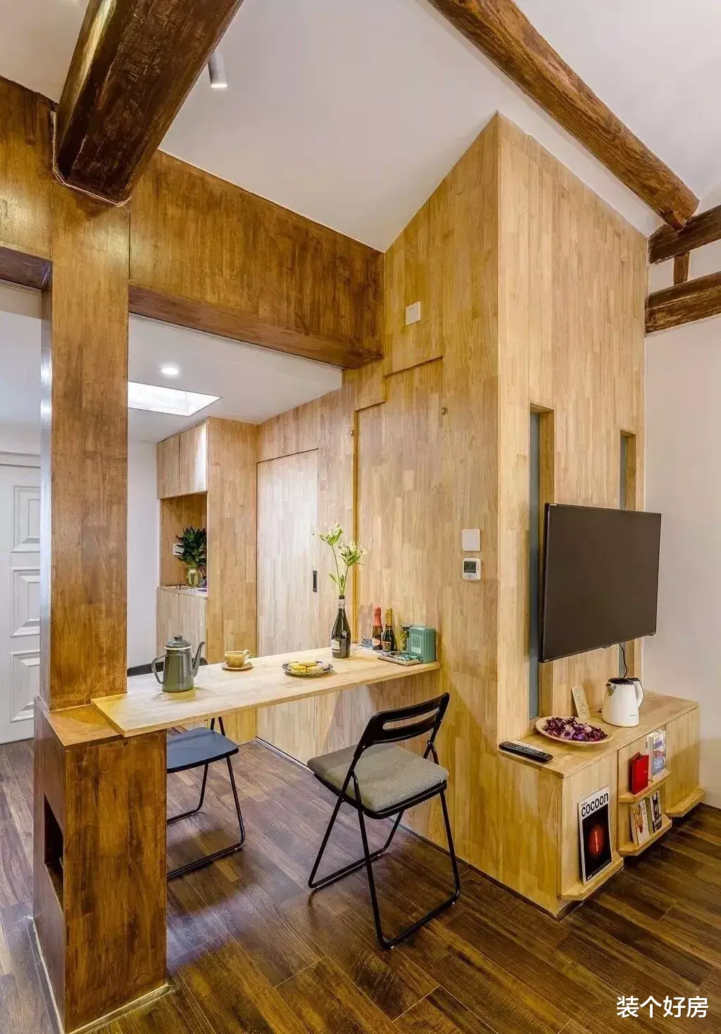 公共空间两侧是整面墙的储物柜,再利用垂直墙面打造出“移动的开合桌板”,这样餐边柜、茶桌、办公桌、餐桌功能就都有了。