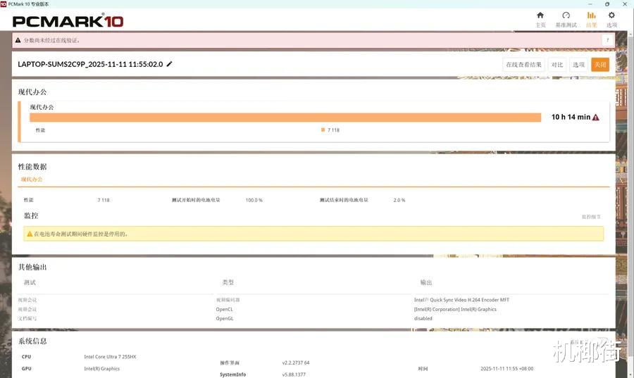 这种能效优势直接体现在华硕天选 6 Pro 的日常使用体验中:无论是课堂笔记、网页浏览等轻度办公场景,还是大型游戏、渲染任务等高负载应用,整机都能保持更低的功耗与更稳定的性能输出。再加上机身内置的 90Wh 大电池,与能效表现更突出的英特尔酷睿Ultra 7处理器255HX相配合,使天选 6 Pro 在 PCMark 10 办公场景测试中拿下了 10 小时 14 分的续航成绩。对于需要频繁移动办公、课堂展示或长时间离电使用的用户来说,这样的续航表现无疑更加友好且更具实际价值。