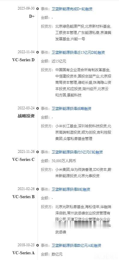 今年9月底,公司完成D+轮融资,引入了北京市绿色能源和低碳产业投资基金、北京市新材料产业投资基金等多家战略投资方,同时广东能源集团、工银资本等知名机构也作为新股东加入。至此,投资卫蓝新能源的机构股东已超过40家。
