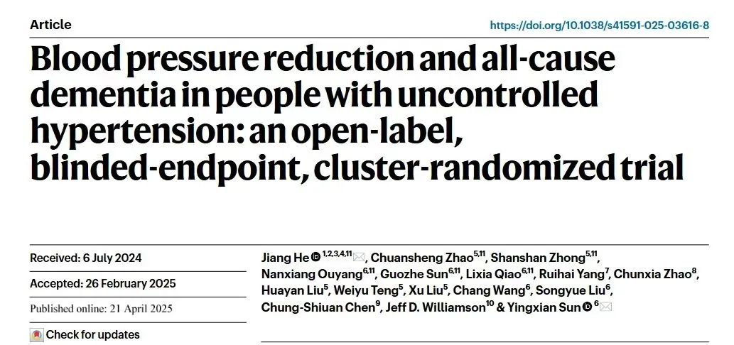 1、He J, Zhao C, Zhong S, et al. Blood pressure reduction and all-cause dementia in people with uncontrolled hypertension: an open-label, blinded-endpoint, cluster-randomized trial. Nat Med. 2025 Apr 21.