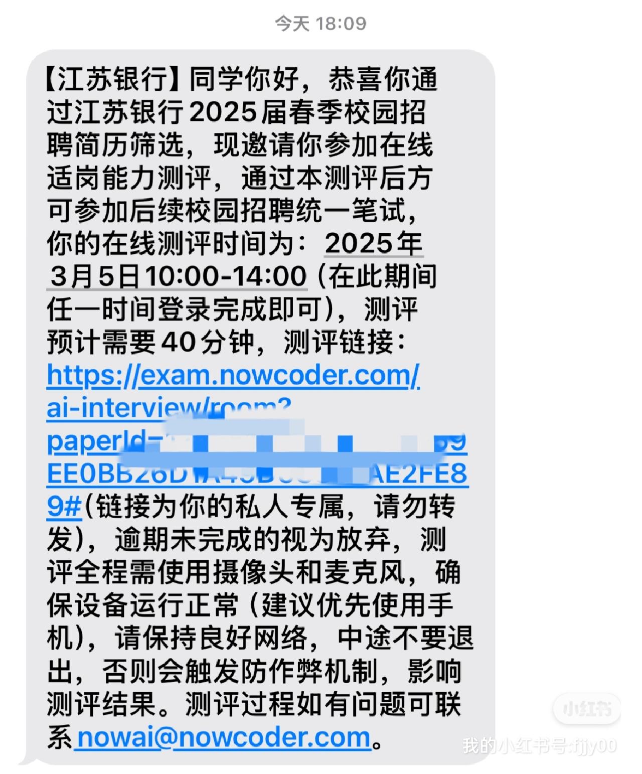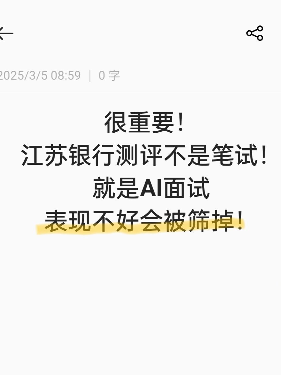 👉第一点:AI面试会考题型 以去年的面试为例,共3-5题平均每题2-3分钟,40分钟基本用不完的,一般会提示时间; 考察题目类型主要以自我介绍、求职动机、个人经历、观点表达、人际关系等这几类为主,例如必考自我介绍以及延伸提问?如何处理你在项目经历中的难题?你的个人职业规划?你的哪些技能和银行业是匹配的? 👉第二点:面试得分建议 1、首先正式回答眼神千万不要飘忽不定,AI会注意你的微表情和微动作,不要看准备的面试稿,AI是能够根据你的眼神分辨你是否是在读稿的,一旦被判定为读稿,极有可能会被pass掉; 2、声音尽可能洪亮,语速不要太快,回答时间要尽可能长一点,尽可能点题,强调关键词,抓住得分项; 3、理清回答思路:首先、然后、其次、最后,不要过度重复口头语,不会的题目按照万能答题框架进行,是什么?为什么?怎么办?三步走基本不太会出错。 👉第三点:AI面试前期准备 1、保证设备网络状态稳定、摄像头清晰度、电量充足;面试环境保持安静; 2、面试第一印象很重要,注意仪容仪表,最好着正装,女生化淡妆,比较提气色,千万不能带口罩; 3、面试真题一定要看,有条件的最好对着镜子或者摄像头多练习,多调整到自己的最佳状态。 备考指导:AI面试真题;自我介绍指导。 ㊗各位小伙伴,成功进笔试! 春招 银行春招 江苏银行 江苏银行测评