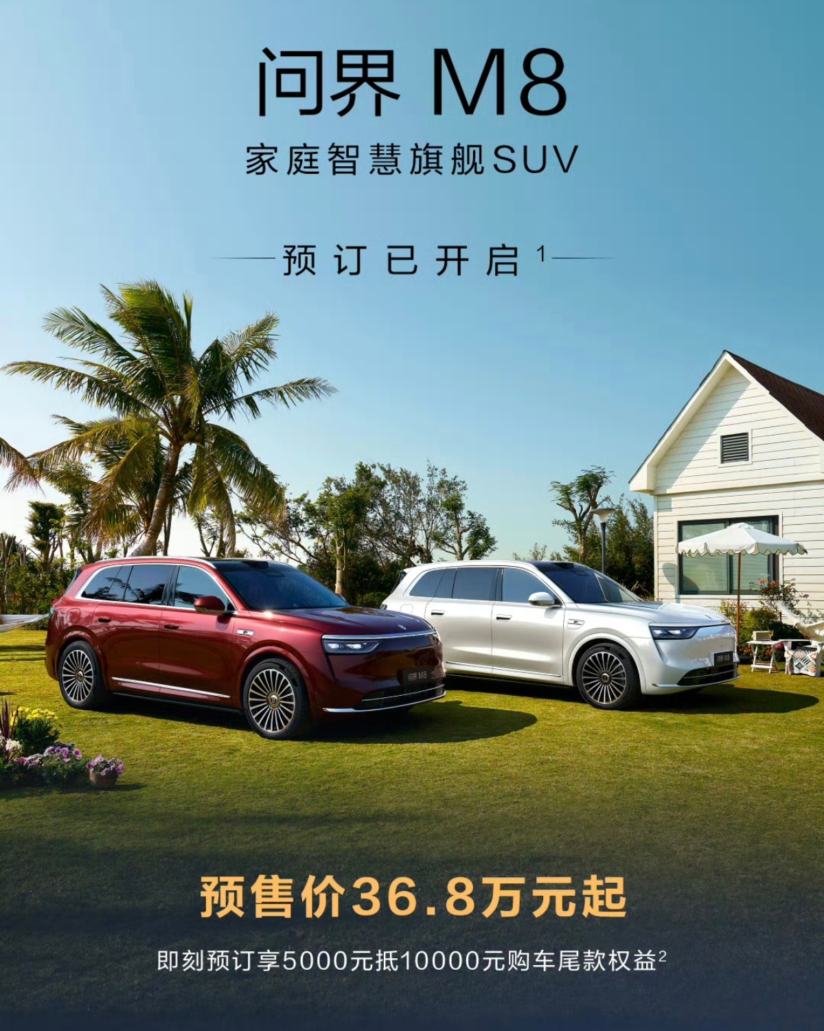 新款问界M9预售价47.8万元起步,问界M8预售价36.8万元起步。