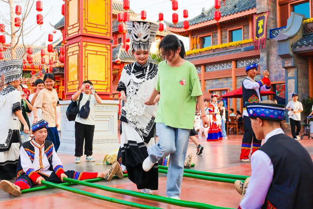 在鹰潭方特东方神画,“全天候沉浸体验”系列精彩活动也吸引了各地游客入园。白天,九州民俗市集热闹开启,现场游客络绎不绝。入夜,园区节庆广场流光溢彩,非遗盒子灯、非遗板凳龙、非遗火壶等表演轮番登场,更有万众期待的鱼龙灯火舞和“千里江山烟花秀”形成陆上灯影与空中焰火的光影盛宴。