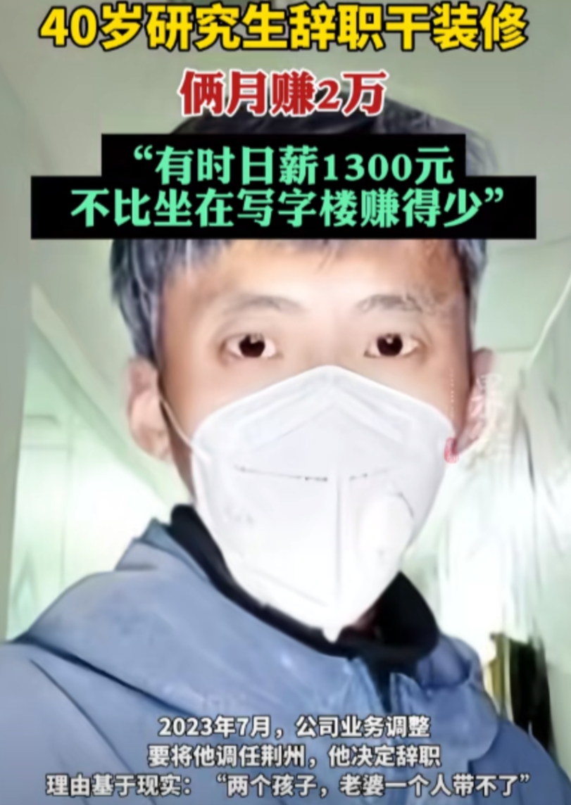 “我觉得挺丢人!”湖北武汉,40岁研究生男子,从华为外包公司辞职,没想到,他找的下一份工作竟然是装修师傅,2个月赚了近2万元,但在开同学会时被问到工作,男子坦言还是挺丢人的!但是,却获得妻子的力挺:只要能养家,就是好工作!