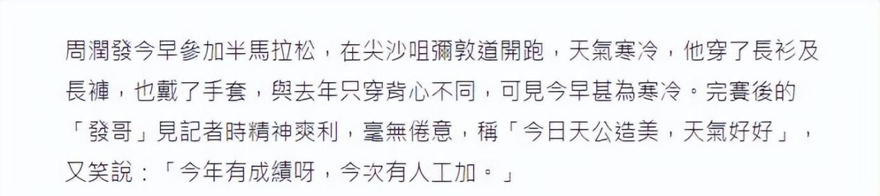 周润发这次参加渣打香港马拉松半马赛事,是他第三次参与渣马比赛了。这次比赛在2025年2月9日清晨7点40分开始,发哥的参赛编号是D8952,被分在半马一组。天气挺冷的,所以他穿了长袖上衣和长裤,还戴了手套,跟去年只穿背心的装扮不一样。发哥说这次天公作美,天气很好,看来他对这次的比赛环境挺满意的。