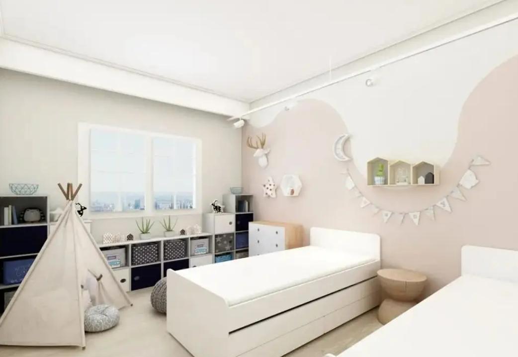 阿姨特地为孩子们的卧室背景墙设置了留白,用来投影用。阿姨说比起笨重又占地方的电视机,投影仪更加符合现在年轻人的品味和喜好。
