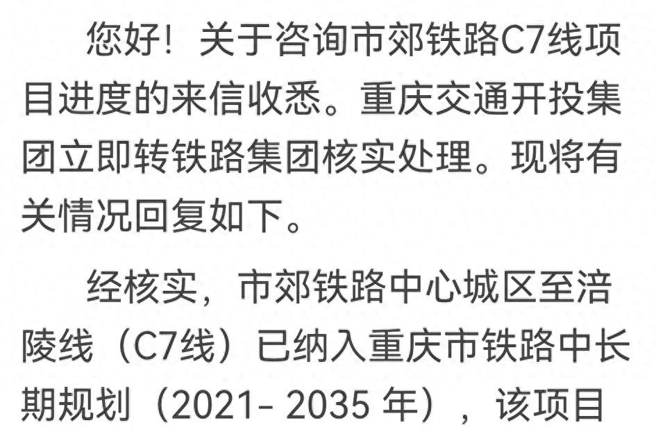 重庆市郊铁路C7线,也就是重庆城区到涪陵的线路。有不少网友希望它早点开工,但又有人说没必要建。这个线路已经纳入重庆铁路中长期规划2021~2035。