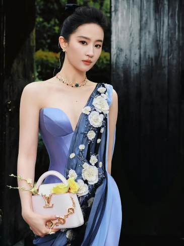 裙子的剪裁也十分考究。从肩部开始,流畅的线条顺着锁骨一直延伸到腰部,修身的设计巧妙地勾勒出刘亦菲纤细的身材。腰部以下则是逐渐散开的裙摆,那裙摆宛如一朵盛开的花朵,每一层都充满了灵动性。当刘亦菲站起来走动的时候,裙摆会随着她的步伐轻轻摇曳,就像是在翩翩起舞。