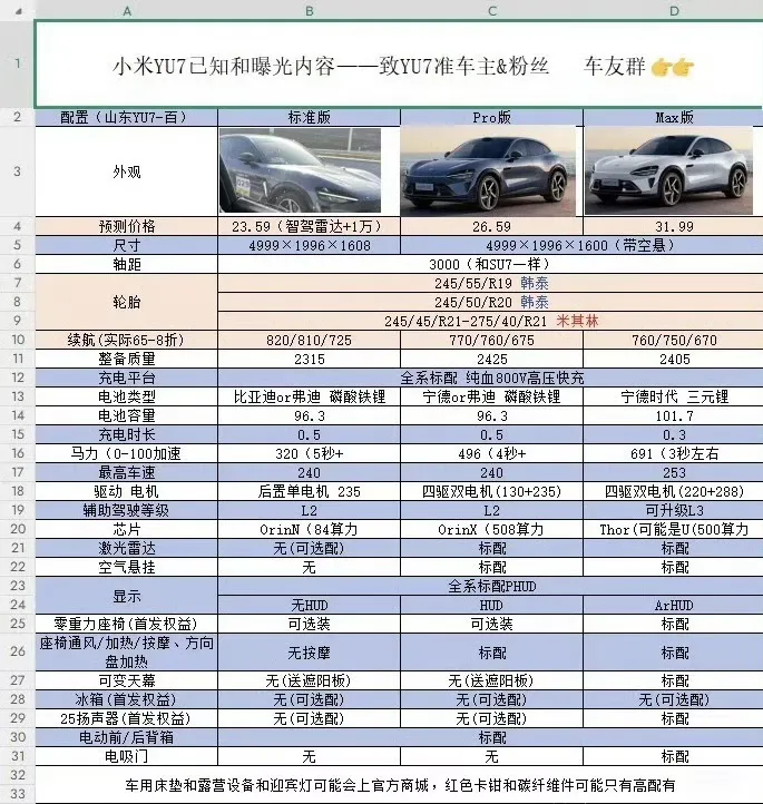 价格屠刀出鞘"23万买四驱轿跑!"这串数字在车友群里炸开时,整个汽车圈都在反复揉眼睛。疑似小米YU7的配置单和售价表在社交平台疯传——标准版23.59万、PRO版26.59万、MAX版31.99万。这张模糊的Excel表格,正在让特斯拉门店的销售们集体失眠。
