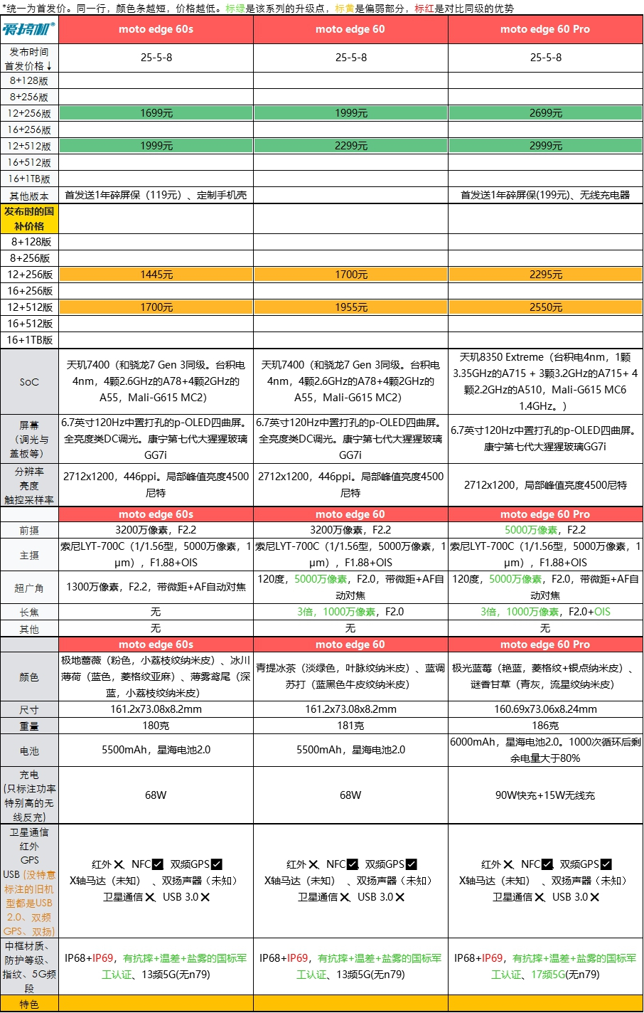 【moto edge 60s】是天玑7400,首发价格是12+256版1699元(国补1445元),12+512版1999元(国补1700元)。首发送1年碎屏保(119元)和定制手机壳。