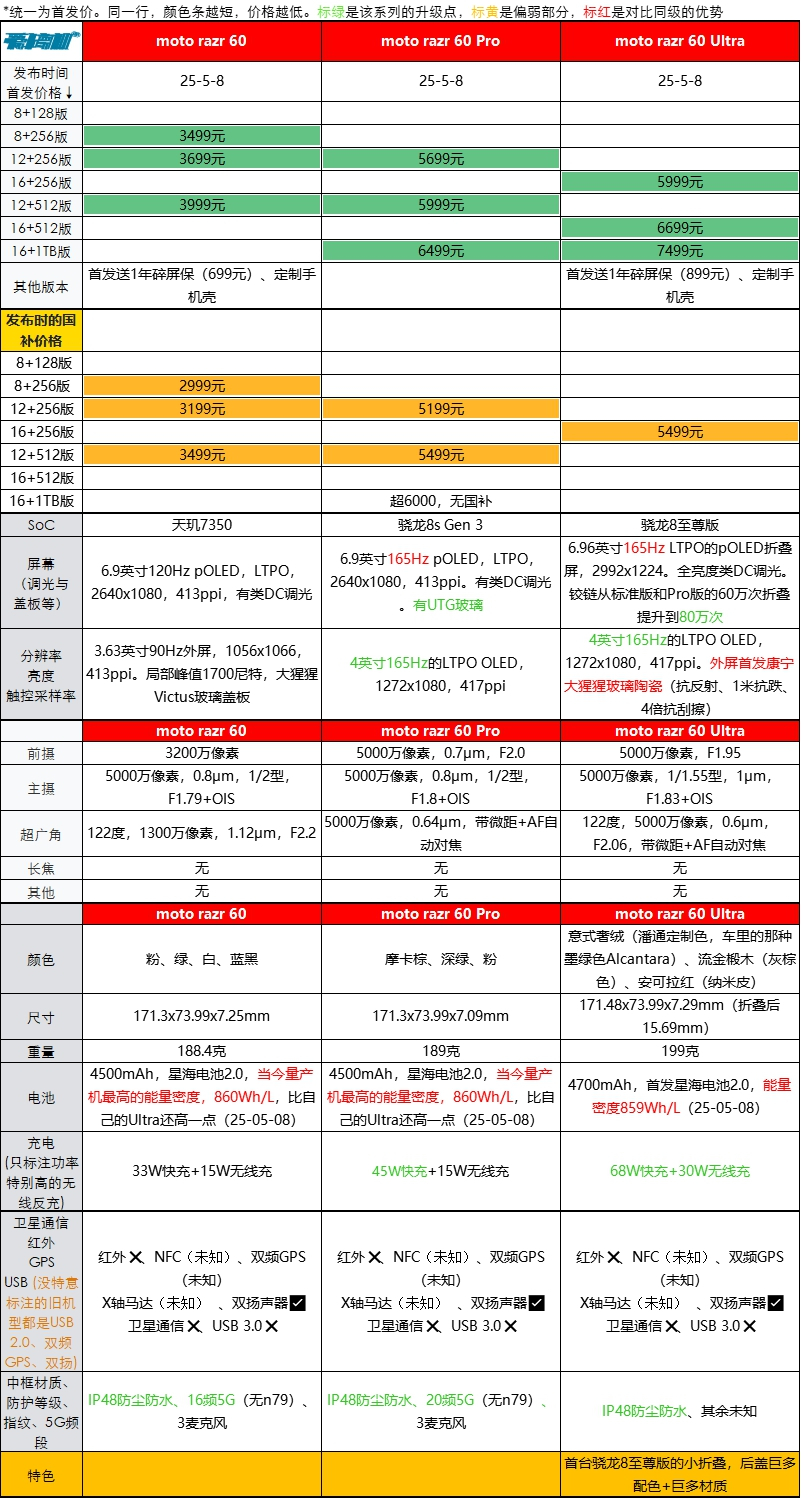 【moto razr 60 Pro】是骁龙8s Gen 3,主要是内屏、充电规格比Ultra弱一些,首发价格12+256版5699元(国补5199元),12+512版5999元(国补5499元),16+1TB版6499元。
