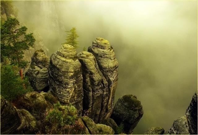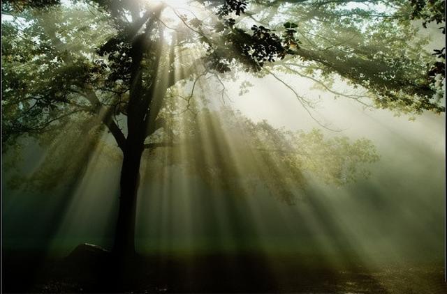 阳光照射进来,将薄雾染成彩色,于是神秘中又增加了浪漫的色彩。
